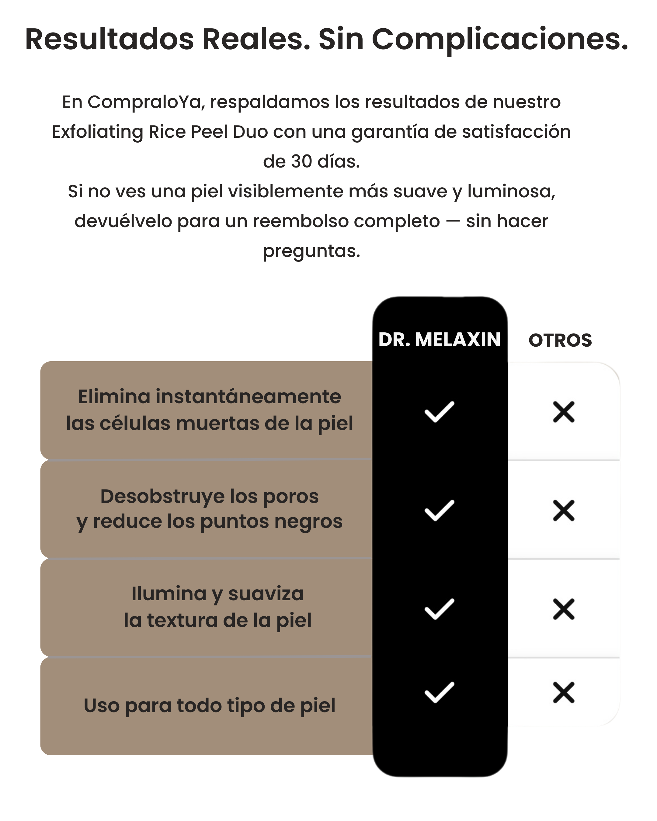 ¡Con resultados efectivos! "Recomiendo el Exfoliating Rice Peel Duo de Dr. Melaxin a quienes buscan eliminar células muertas, destapar los poros y lograr al instante una piel más suave y uniforme. Es una solución suave pero poderosa para conseguir una piel más luminosa y saludable sin irritación."